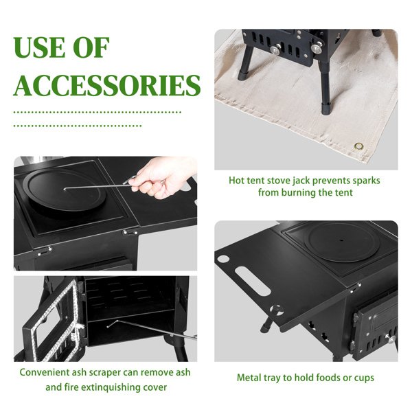 PortableWood Stove.The folding racks on both sides increase the functionality of easy portability, 32.2lbs. The side frame can be used as a portable. The foldable legs can be folded flat under the stove. The chimney tube can be easily stored in the furnace for easy transportation and storage. The hookthat comes with the woodstove makes it easy to clean the ashes at the bottom. Provide more convenience for your camping/hunting trip.